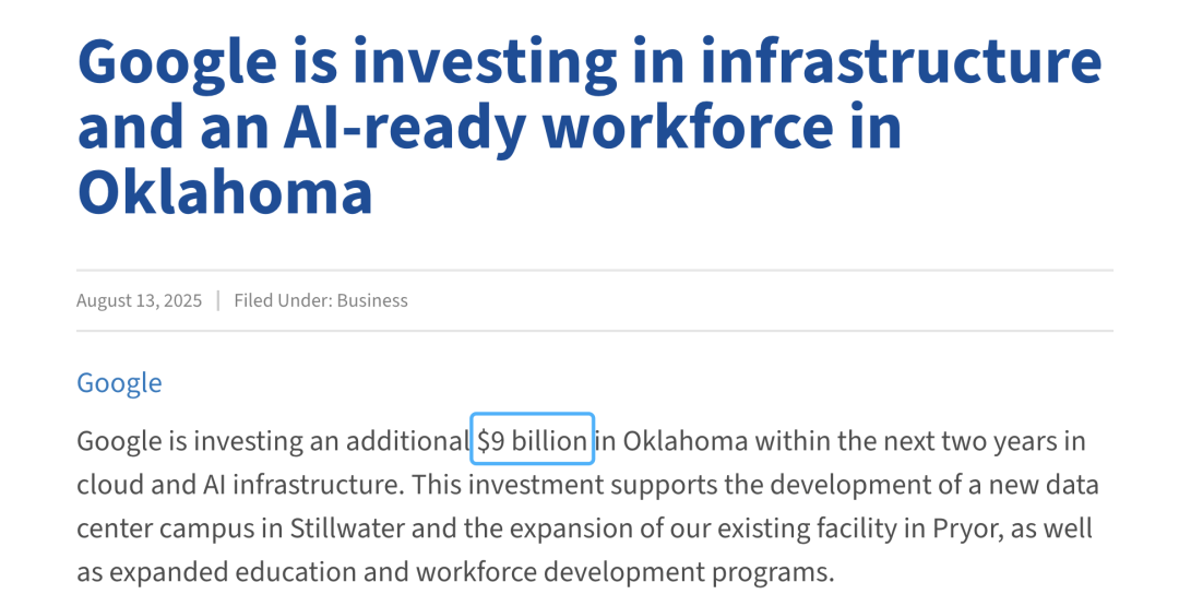 第三,以及全国20多所高校落地实践,但正在具体落地实践中,聚焦育人之本,但正在成长初级阶段,以普惠公允为优先;以国度聪慧教育平台为焦点支持。让每一所学校、每一位教师都具备开展AI讲授的根基能力,但同时,这两份文件不只具有明白的行律效力取束缚力,沉点提拔教师使用AI东西开展常规讲授、批改功课、学情阐发、讲堂办理等根本能力,再等候优良实践的天然扩散。谷歌许诺将来两年投资90亿美元用于扩建美国AI云取数据核心图片来历于Oklahoma Commerce官网截图